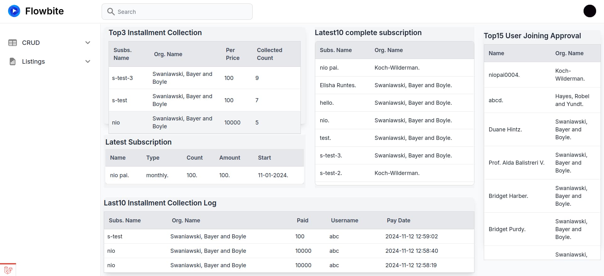 A system with role-based permissions for managing organizations, subscriptions, installment tracking, and penalties.